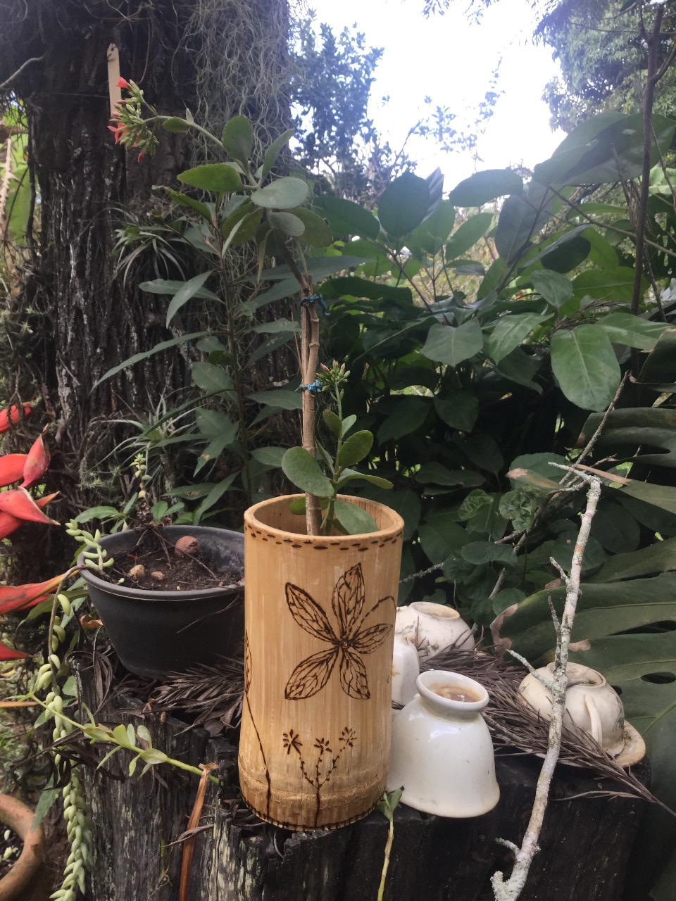 Cachepot de bambu agroflorestal decorado, com planta Calanchoe, feito por Rosângela, no Sítio do Galo, Saquarema, RJ.