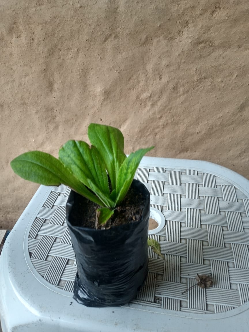 Muda de Tanchagem cultivada por Marilza no Viveiro da Ecovila Nascentes do Tinguí, Saquarema, RJ.