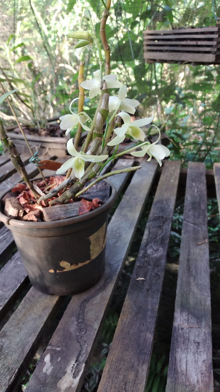 Orquídea Dendrobium híbrido variação amarelo cultivada no Sítio do Galo, Saquarema, RJ.